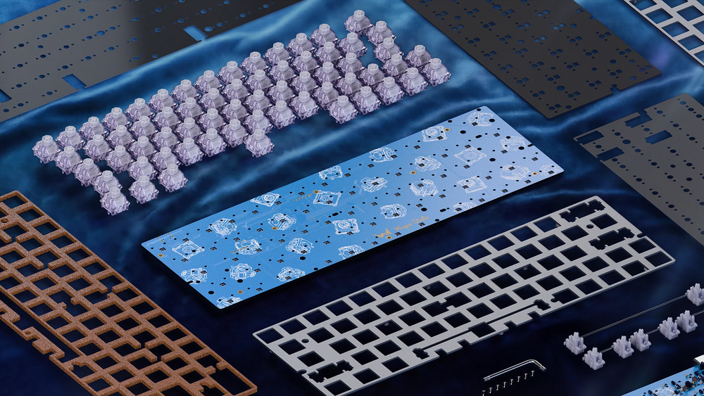 内部は「2mmアルミPCB+アルミプレート+コルクフォーム」の高剛性スタック。 フレックスを抑えて構造安定性を最大化し、押下の感触を均一に整えます。