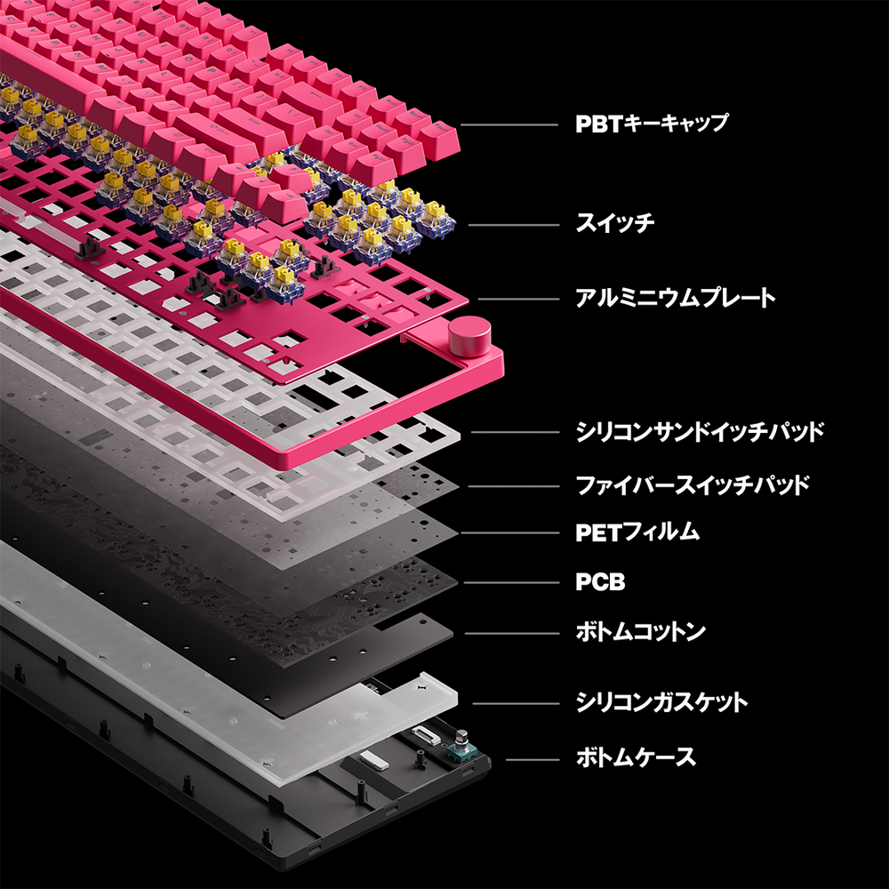 内部は5層構造(シリコンサンドイッチパッド/ファイバースイッチパッド/PETフィルム/ボトムコットン/シリコーンガスケット)。余計な響きを抑えつつ、打鍵のブレを整え、クリアで心地よい打鍵音と“しっかり感”を狙っています。
