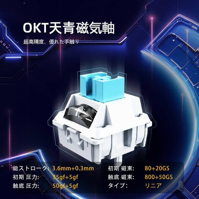 OKT天青磁気軸は、ラピッドトリガーに対応した最新のホールセンサー技術を採用したキースイッチです。キーを押し込んだ距離ではなく、磁力の変化で入力を検知するため、キーを僅かに戻すだけですぐに再入力が可能。物理的な接点もなく、ゲームでもタイピングでも、かつてないほどの精度と応答速度、そして滑らかな操作感を提供します。